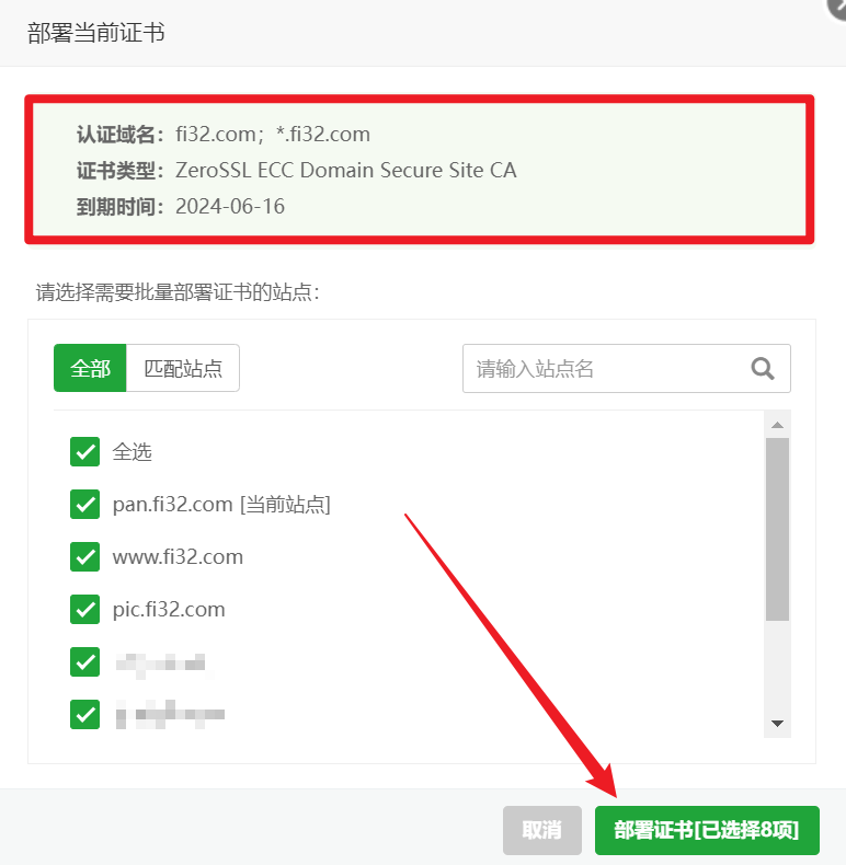 查看fi32.com.key及fi32.com.cer并复制进宝塔面板该域名下任一网站的SSL内容填写区,会生成一个证书夹,选择该证书并应用到所有该域名下其他网站即可。