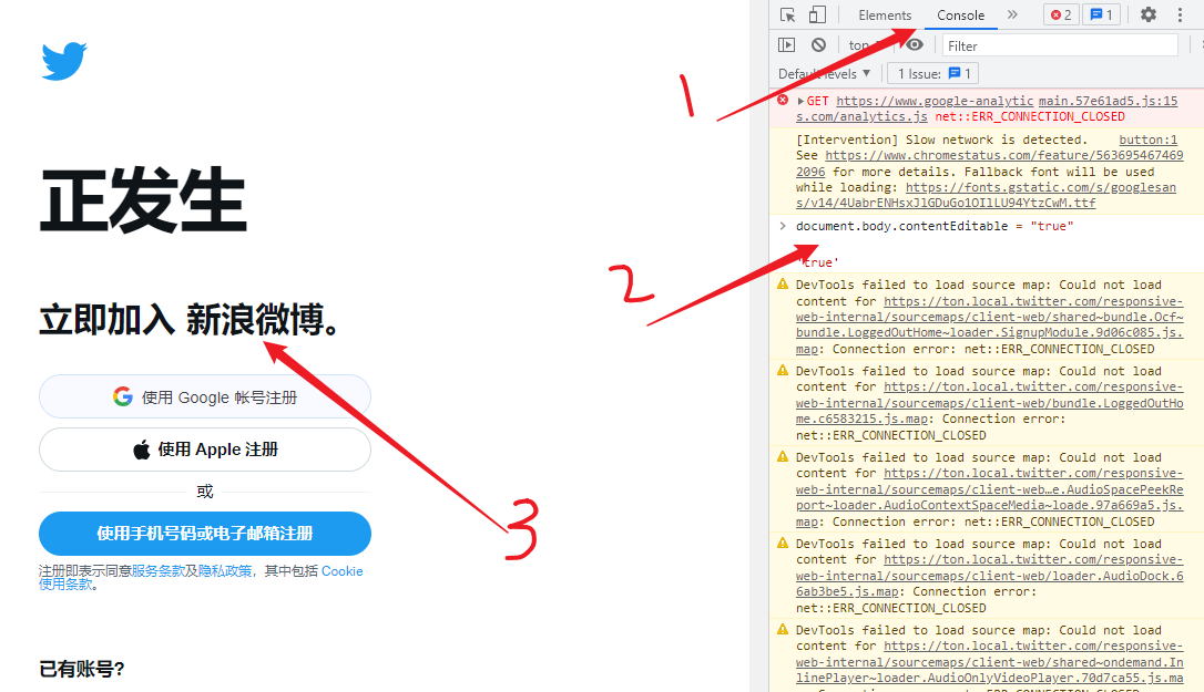 使用方法:在Google Chrome浏览器中打开要编辑的网页,然后在该页页面按F12弹出开发者工具面板,点击Console进入控制台选项卡,输入代码1,就可以编辑该页面内容了,编辑结束后,输入代码2,退出编辑状态。