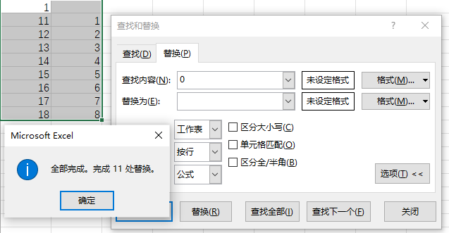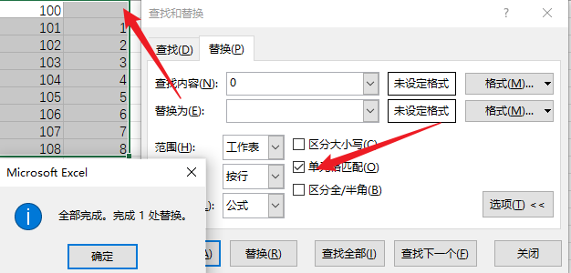 我需要的效果是只替换值为0的单元格为空白,这就尴尬了,于是Google了一番,方法很简单,选择单元格匹配即可。以下为正确方法替换后的结果,也是我想要的结果